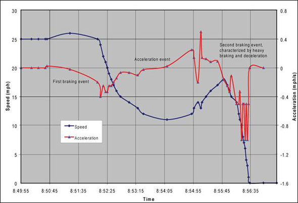 - At 0851:47, the automatic braking reduction and release caused a local, but not significant, disturbance of the deceleration. The train deceleration was within a safe range (-0.4 mph/second).