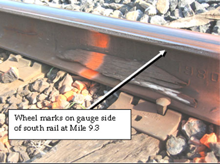 Examination of the rail revealed multiple wheel flange marks on the gauge side of the north and south rail. Some wheelsets were straddling the south rail, east of where the rail had fractured at thermite welds. Damage to crossties, anchors, and spikes was predominantly to the gauge side of both rails. The wheel marks were traced back to the vicinity of Mile 9.3, where there were marks on the head and gauge side of the south rail (see Photo 1). Approximately 20 feet to the east, there were similar wheel marks on the north rail. In the vicinity of these wheel marks, spikes on the gauge side were lifted, consistent with the rail having canted out.