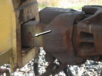 Many of the derailed cars showed recent impact marks on the centre of the car end sill draft opening and the coupler horn. Examination of a group of 10 air dump cars revealed that 7 of these carsFootnote 4 had severe gouging on the sides of their coupler shanks and impact marks on the side of the car end sill openings (see Photos 2a and 2b). These gouge marks were most prominent between cars BGSX 122226 (the 23rd car) and BGSX 122227 (the 24th car). In addition, the wheel treads on these two cars were battered and scored.