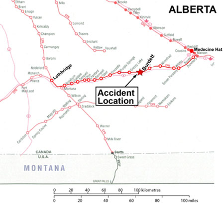 On 30 November 2008, at 1604 mountain standard time, Canadian Pacific freight train 356-196, proceeding eastward from Lethbridge to Bellcott, Alberta, derailed 18 empty covered hopper cars at Mile 45.62 of the Taber Subdivision near Burdett, Alberta. No dangerous goods were involved and there were no injuries.