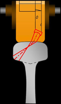 The transducers are housed in fluid-filled wheels mounted in a roller search unit carriage that couple the transducers to the rail (see Figure 2 below). A liquid couplant consisting of a thin film of water mixed with glycol or calcium facilitates the transmission of ultrasonic energy from the transducers into the rail. The transducers are set at different angles to achieve the best inspection coverage possible.