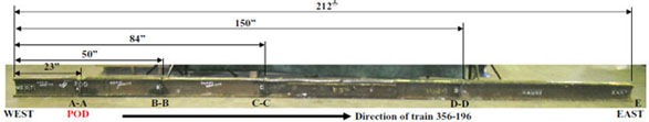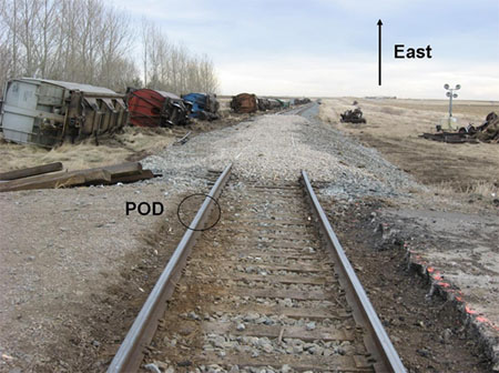 Pre-existing fatigue defects identified as DFs were found on three fracture surfaces of the recovered pieces of rail. The largest one, at 20 per cent of the rail head's cross section head area, was observed in the gauge corner of the rail in the west fracture face of break A-A. With batter displayed on the east fracture face, break A-A was identified as the POD. Once initiated, the detail fracture continued to grow with the passage of trains, in turn decreasing the rail's ability to withstand wheel loads. The expanding defect reduced the load-carrying capacity of the rail until it could no longer support the weight of the train, causing the rail to break, resulting in the train derailment and additional fracturing of the rail.