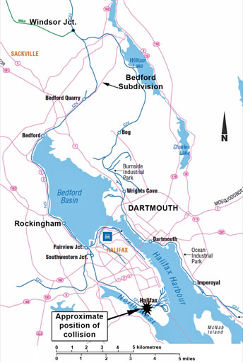 Canadian National (CN) train Q121-11-03 (the CN train) consisted of four locomotives, weighed approximately 790 tons, and was about 285 feet in length. The fourth locomotive was shut down, but the brakes were operative. The engines were proceeding from the CN Fairview shop tracks in Halifax, Nova Scotia, on the Bedford Subdivision to pick up container cars at Halifax Ocean Terminals (HOT) (see Figure 1).