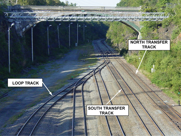 After its arrival at the station, the VIA train reversed westward on the north transfer track (see Photo 2) and entered the loop track at HOT. After completing the loop, the VIA train came back towards the north transfer track because the switches were already lined. The crew planned to stop and reverse eastward on the south transfer track into the Halifax VIA station. The VIA conductor remained at the east end of the train, in order to restore the derail for the loop track and to line the switches.