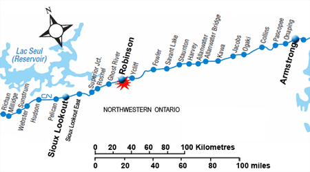 At approximately 0435 central standard time on 13 February 2009 while proceeding eastward on the Allanwater Subdivision, Canadian National Freight train M30451-09 derailed 2 locomotives and 29 cars just east of the east siding switch at Robinson, Ontario, approximately 20 miles east of Sioux Lookout, Ontario. The derailed cars included a load of sodium chlorate (UN 1495) and two loads of propane (UN 1075). The derailed cars struck a wayside propane tank that fuelled a switch heater, igniting a fire and causing an explosion. There were no injuries.
