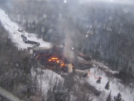 An 800-gallon wayside propane tank, which was used to fuel the Robinson east power switch heater, was located on the railway right of way about 50 feet north of the switch (see Figure 2). During the derailment, rolling stock struck and breached the tank, which resulted in an explosion and a fire. The fire engulfed most of the derailment site, including approximately 15 of the 29 derailed cars. Two tank cars of lard and a carload of lumber were consumed in the fire (see Photo 1). Several bulldozers and large backhoes were brought to the accident site to contain the fire and to work on restoring the rail line. The heavy equipment spread the damaged rolling stock about the site and covered it in snow in an effort to extinguish the fire, which burned for about 24 hours. Once the fire was under control, site remediation continued.