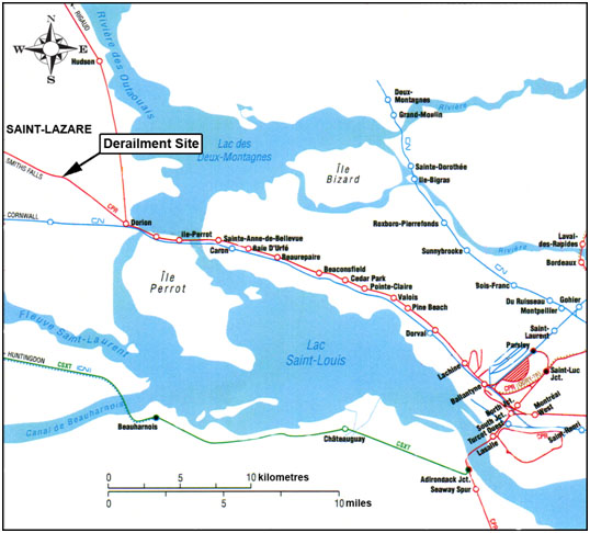 On 23 September 2010, at approximately 2335 Eastern Daylight Time, Canadian Pacific Railway freight train 159-23 derailed 2 locomotives and 11 loaded cars at Mile 22.2 of the Winchester Subdivision near Saint-Lazare, Quebec. Approximately 500 feet of track was damaged. The accident caused two minor injuries and a small spill of dangerous goods.