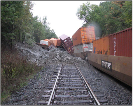 - The train derailed upon hitting an obstruction caused by a thick layer of clay having slid from the adjacent land onto the track.