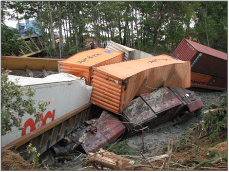 Once the crew saw that the track was obstructed by debris, the locomotive engineer initiated an emergency brake application. However, the train was not able to stop before hitting the debris. Upon impact, the locomotives and the first 11 cars derailed and piled up.