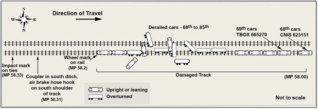At Mile 58.33, two ties displayed fresh impact marks between the rails. Wheel marks were observed on the web of the north rail at Mile 58.20, about 700 feet east of the damaged ties. The rail had lifted out of the tie plates and was resting on the spikes. The rail was broken and the track was destroyed for approximately 500 feet. Further east, the north rail was rolled over all the way to the first derailed car, CNIS 623151, the 68th car from the head end. The 69th car, TBOX 665279, and the following 3 cars stayed coupled together and were derailed upright on the track. Sixty feet to the west, cars CNA 404920 and CNA 407068 were overturned off their trucks and were resting on their sides. The remaining derailed cars had piled up and were fouling both the north and south main tracks (see Figure 2).