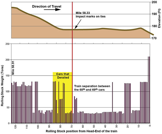 - Because the trailing portion of the train was composed of mainly loaded cars and was situated on a steeper descending grade, it decelerated at a slower rate and collided with the leading portion of the train.