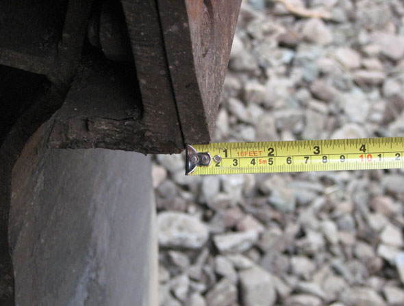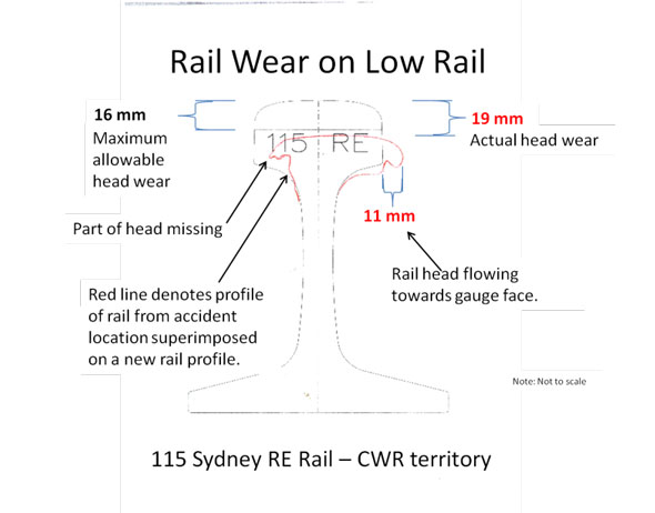 Post-accident track measurements for cross-level and gauge for 15 stations (measured 15 feet 6 inches ) east of the point of derailment were performed (see Appendix B). The examination of the rail revealed that the rail head was flattened and worn. The combined rail wear (i.e., head and gauge face wear ) was 12 mm on the high (north) rail and 19 mm of vertical head wear on portions of the low (south) rail of the derailment curve (see Photos 4 and Photo 5).