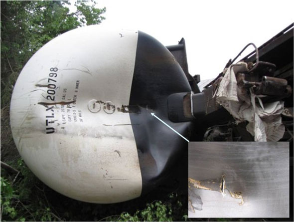 The 45th, 46th and 48th cars had broken coupler shanks. The shanks on these double shelf couplers broke, and the tank cars overturned and were subjected to additional damage. Once separated, the protection afforded by the double shelf couplers against head punctures was reduced.