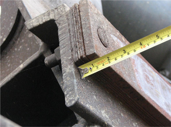 The car was observed with dissimilar body side bearing shims (left versus right) at each end of the car. The left side of the B-end (BL) (see Photo 2a) was shimmed approximately 7⁄8 inch while there were no shims on the right side (BR) (see Photo 2b). The left side of the A-end (AL) was shimmed at least 1⁄4 inch more than the right side (AR).