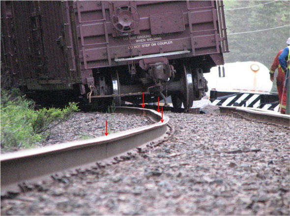 The derailment site was surveyed and the final positions of the derailed cars were identified (see Appendix A). Wheel marks were visible on top of the high (north) rail approximately 40 to 50 feet into the exit spiral of the 4° curve. These marks stretched over 400 feet westward, along the ties and base of the north rail, up to the zone where the track was destroyed.