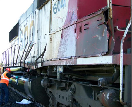 As the truck did not appear to be slowing down, the crew braced for impact. Following impact, the crew applied a full service brake application to bring the train to a controlled stop. Approximately 25 seconds later, the train experienced an undesired emergency brake application (UDE) and the head-end came to a stop about 1600 feet south of the crossing at Mile 14.05. Subsequent inspection determined that the truck had struck the second locomotive in the consist, SOO 6041 (see Photo 1). The locomotive was not derailed but its fuel tank was punctured, releasing about 4000 gallons of fuel. The first 22 car bodies behind the locomotives had derailed.