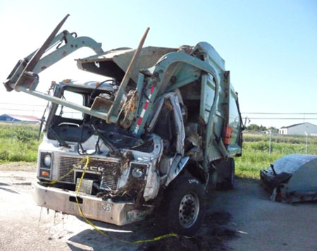 At about 0700 Central Daylight Time on 14 June 2010, Canadian Pacific Railway freight train 290-14 was proceeding southward at 25 mph on the Emerson Subdivision when it was struck by an eastbound garbage truck travelling at a speed of at least 60 km/h, as the train occupied the passive crossing at Mile 13.85, near Grande Pointe, Manitoba. As a result of the collision, 22 car bodies derailed and the fuel tank on the second locomotive was punctured releasing about 4,000 gallons of diesel fuel. The garbage truck was destroyed and the driver was seriously injured.
