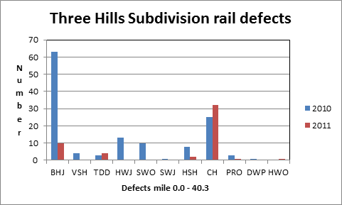 A summary of the rail flaw detection information for 2010 and 2011 for the Three Hills Subdivision is presented in Appendix B. For this period, all defects were located in older vintage rail (Algoma/Dosco/Dominion). In 2011, there were 54 in-service rail failures on the subdivision, but none in the vicinity of the derailment.