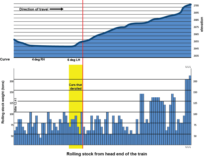 Chart depicting the elevation of the track section where the derailment occurred, with relation to the weight of the rolling stock as it passed over that section of track