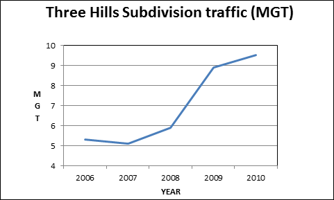 Chart depicting the significant increase in traffic on the Three Hills subdivision, from 5.1 to 9.5 million gross tons between 2007 and 2010