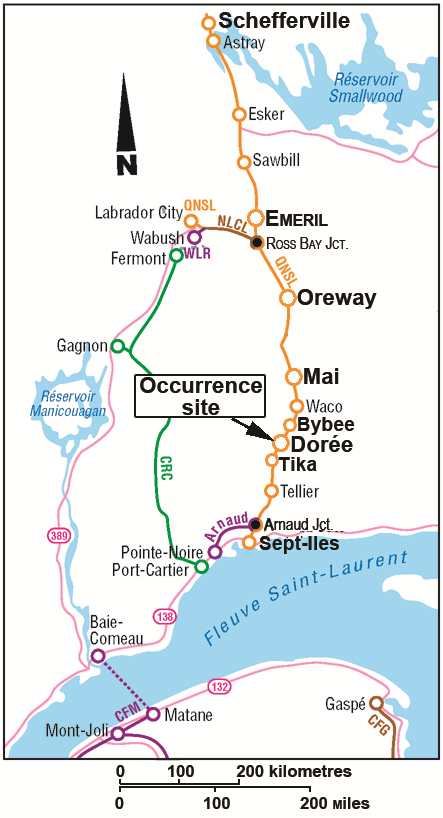 On 10 December 2011, freight train LIM-55 (the train) loaded with iron ore left Emeril Junction, Newfoundland and Labrador, southward towards Sept-Îles, Quebec, on Quebec North Shore and Labrador Railway (QNS&L) Wacouna Subdivision (Figure 1). It consisted of 2 QNS&L locomotives and 112 Labrador Iron Mines (LIM) gondola cars. It weighed 10 070 tons and measured 6080 feet.