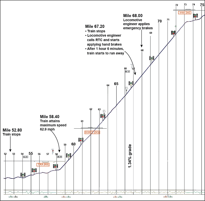 The locomotive engineer contacted the RTC to advise of the situation and was instructed to apply hand brakes to secure the train and to wait for assistance. Just over an hour later, as the locomotive engineer was returning to the locomotives, he noticed that the train was starting to move. He boarded the lead locomotive and fully applied the dynamic brakes. However, the dynamic brakes were unable to control the movement and the train continued to accelerate, reaching a maximum speed of about 63 mph. The train finally came to a stop at the bottom of the slope, Mile 52.80, without derailing (Figure 2).
