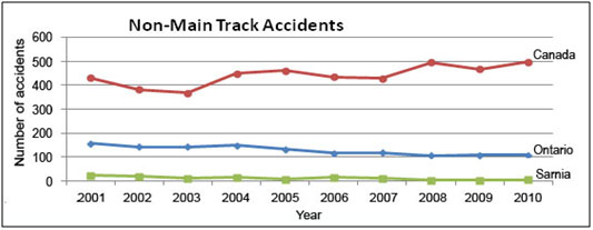 Since 2007, the total number of accidents at Sarnia Yard has decreased significantly. The Yard has reported only 1 collision in the past 3 years, down from an average of over 5 collisions per year for the rest of the decade (see Figure 3). Sarnia Yard has been recognized for its low accident rate and had previously received a company award in recognition of this achievement.