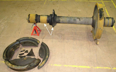 - The hub of the fractured wheel was still on the axle (see arrows in Photo 1), but it had been forced inboard off its seat.