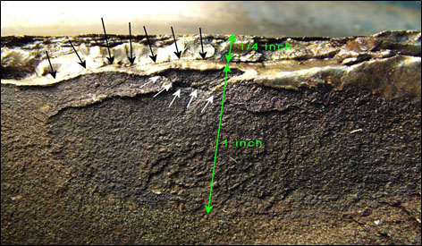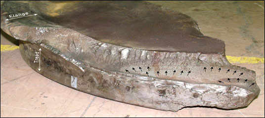 - The subsurface crack parallel to the tread that caused the shell was visible. There was also a secondary crack extending from the bottom of the shell, perpendicular to the tread, downward into the wheel.