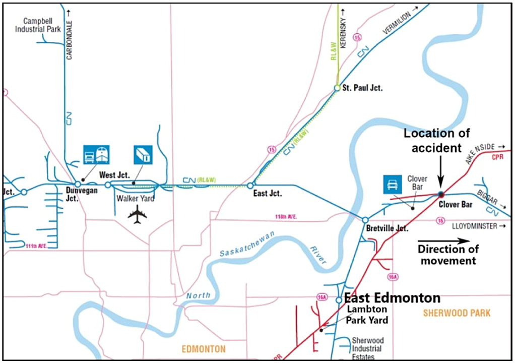 At approximately 0830 Footnote 1 on 26 December 2012, eastbound Canadian National (CN) freight train Q-19051-24 (train 190) departed Edmonton, Alberta, destined for Wainwright, Saskatchewan. The train was comprised of 2 locomotives and 173 loaded cars. It weighed 10 388 tons and was 11 027 feet long. Train 190 was operated by a locomotive engineer and a conductor. Both crew members were qualified for their respective positions, were familiar with the territory, and met company and regulatory fitness and rest standards.