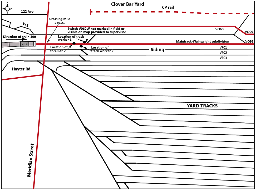 At the time of the accident, there was no CN employee accompanying the A&B track maintainers, and no additional protection (e.g., maintenance protect authority) had been obtained for the snow-blowing activities at Clover Bar. The CN employees were enroute to the east end of the yard with the snow jet. The A&B track maintainers were provided with the Clover Bar evacuation map (Figure 3). As the A&B employees were not familiar with the territory, they had some difficulty locating the specific switches that they were instructed to clean. Further conversation between the A&B supervisor and CN managers determined that those switches had already been cleaned, so the A&B track maintainers were redirected to start clearing switches eastward from the nearest switch encountered until they met up with the snow jet.