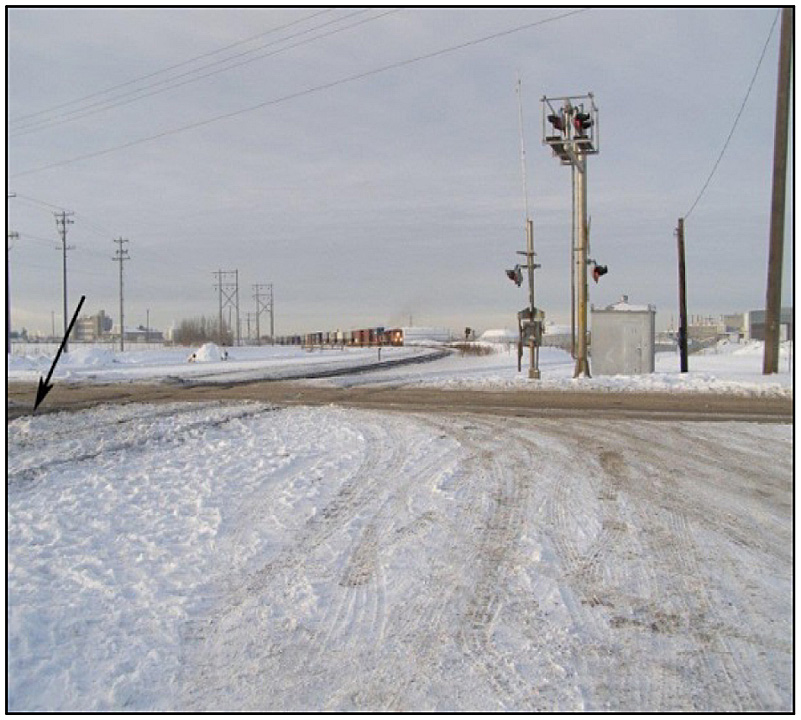 At approximately 0909, while travelling at 27 mph on the main track of the Wainwright Subdivision through Clover Bar in Edmonton (Figure 1), train 190, with a clearFootnote 2 signal, rounded a 2° right-hand curve (Photo 1). About 1350 feet ahead, the crew noticed 3 track maintainers (a foreman and 2 track workers) working on the main track just beyond the public crossing at Mile 259.21 (Photo 2 and Figure 2). The 2 track workers were wearing portable gas-powered backpack blowers. Train 190's bell and horn were sounded as per Rules 14(l) and 14(f)Footnote 3 of the Canadian Rail Operating Rules (CROR). In the absence of noticeable reaction from the track maintainers, the train crew initiated an emergency train brake application.