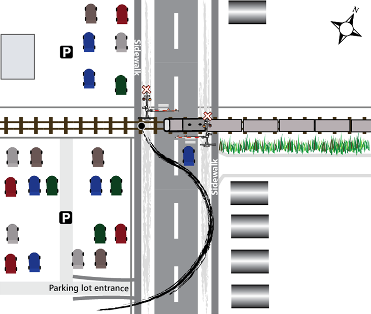 The pedestrians had gone to the Gibraltar Centre to have lunch and meet with pedestrian 1’s parents. After making plans for the evening, the pedestrians departed the Gibraltar Centre en route to pedestrian 2’s residence. As they left the Gibraltar Centre, they crossed through the parking lot and exited onto the north end of Third Street, about 250 feet south of the crossing. Upon exiting, they heard the crossing protection activate and they began to run. In the process, pedestrian 1 dropped a water bottle and stopped to pick it up. They then ran across to the east side of Third Street. As they neared the crossing, both pedestrians cut diagonally behind a car stopped at the crossing and ran back across to the west side of the road. Upon hearing the train, pedestrian 2 stopped on the road, while pedestrian 1 continued and ran into the path of the train (Figure 2).