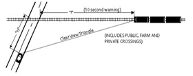 - Where gradients within 8 m of rail exceed 5% or heavy or long vehicules regularly cross, clear view from a vehicule stopped at the crossing must also extend a minimum of 50% beyond “T”, and more if necessary, so stopped vehicules have sufficient time to start up and cross safely.
