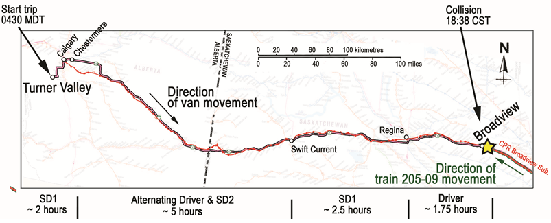 About 2 hours into the trip, they stopped at Chestermere, Alberta, to pick up a suitcase, after which they changed drivers and continued. SD2 and the driver alternated driving from Chestermere to Swift Current, Saskatchewan, while SD1 napped in the back of the van. SD1 then drove from Swift Current to Regina, Saskatchewan, while the driver napped. Departing Regina, the driver resumed driving under SD1’s supervision. Throughout much of the trip, the Canadian Pacific Railway (CP) tracks ran parallel and close to Highway 1 (Figure 1).