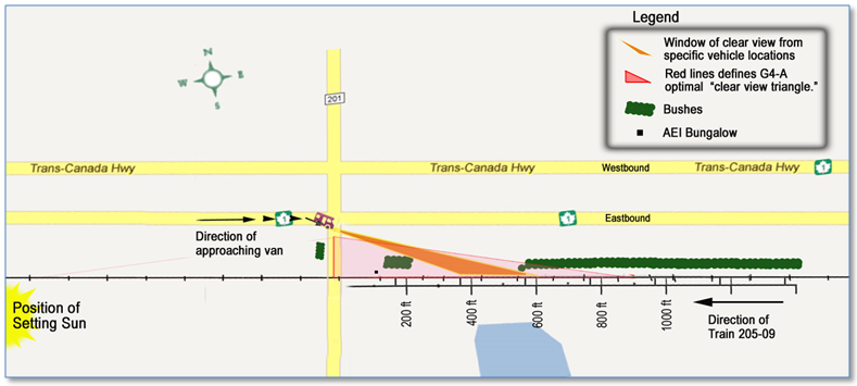 - For vehicles travelling east on Highway 1 and for those turning south onto Airport Road, the trees and bushes obstructed the driver’s view of approaching trains from the east.