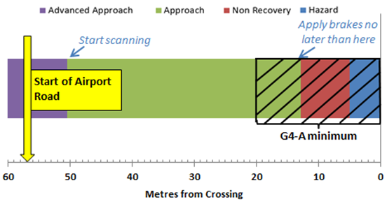 Transport Canada (TC) accepts that a 2.5-s PRT does not address all circumstances but contends that it generally reflects the response time required for 9 out of every 10 drivers encountering an intersection. While this may be true for roadway intersections where a traffic light or other stimulus is directly in the driver's field of view, it is not appropriate for passive railway crossings, where additional scanning is necessary. As demonstrated by this accident, when the time for scanning activities is included, a more realistic PRT for the passive level crossing was estimated to be 4.5 s. In these situations, some form of additional crossing protection is required to compensate for the PRT shortfall.