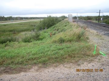 At 1834, the train was proceeding westward at 53 mph on the Broadview Subdivision with the ditch lights on and the headlights on full power. The track in this area is situated 50 m to 60 m south of Highway 1. The land between the highway and the tracks is covered predominantly with prairie grass. The track is elevated, lined by intermittent stands of trees and occasional clumps of dense brush on both sides of the track. Approaching the crossing, the train crew’s view of Highway 1 was obstructed by trees along the north embankment of the railway right-of-way (ROW).