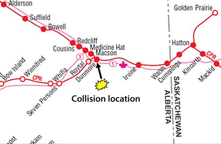 On 18 May 2013, at about 1330,Footnote 1 westbound Canadian Pacific Railway (CP) train 351-424 (train 351) struck the side of eastbound train CP 100-17 (train 100) at Mile 138.7 of the Maple Creek Subdivision in Dunmore, Alberta (Figure 1). Train 351 comprised 2 head-end locomotives, 1 mid-train remote locomotive, and 112 loaded grain hopper cars. The train weighed 14 012 tons and was 6667 feet in length. Train 100 comprised 1 head-end locomotive, 1 tail-end remote locomotive, and 49 loaded container cars. The train weighed 5567 tons and was 6414 feet in length.