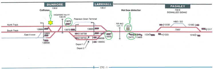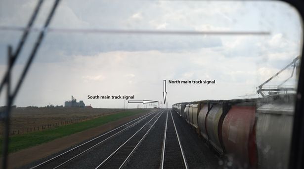 - The collision occurred when train 351 was operated past the Stop signal at Dunmore, Alberta, (signal 1387N) and into the side of train 100 that was crossing over from the north main track onto the Depot 1 track.