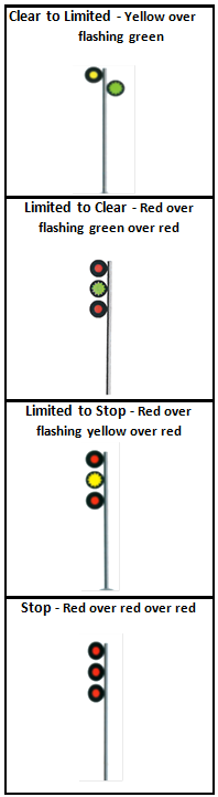 - record a checkmark in the "Clear Signal" column or the name of the signal, using the first two letters of each signal name I.e.: "CL" = "Clear", "CL to ST" = Clear to Stop, Etc. in the "Other than Clear Signal" column;