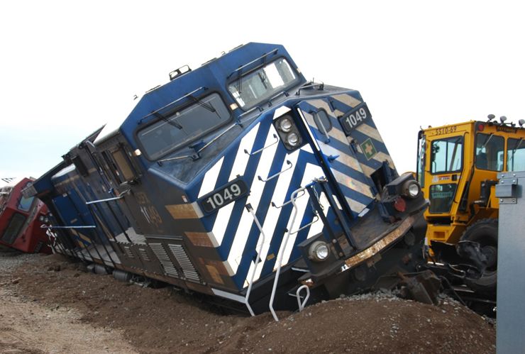 Train 351 travelled approximately 1100 feet past the Stop signal and collided with the 39th car of train 100. At the time of the collision, train 351 was travelling at 20.2 mph. The lead locomotives of train 351 (CEFX 1049, CP 9804) derailed to the north and came to rest leaning at about 20 degrees and 70 degrees respectively (Photo 1).