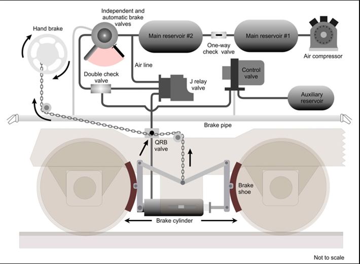 When the air brake control valves sense a drop in pressure in the brake pipe, they are designed to activate the brakes on each car. In this accident, however, the rate of leakage was slow and steady—approximately 1 pound per square inch per minute—and so the automatic brakes did not apply.
