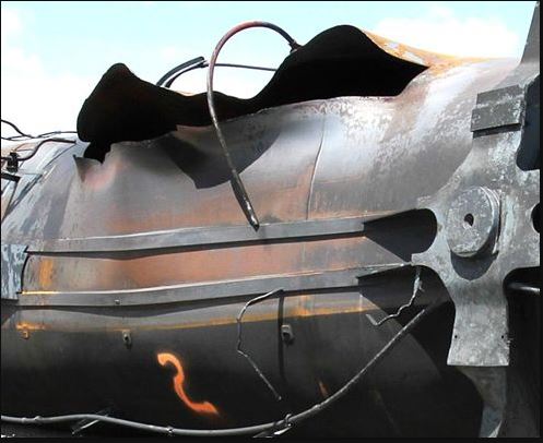 Almost every car that derailed was breached, some in multiple areas, including shells, heads, top and bottom fittings, and pressure relief devices. The exact location and extent of the damage varied depending on the orientation and speed of the cars during the derailment.