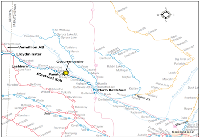 The Blackfoot Subdivision commences at North Battleford, Saskatchewan, (Mile 0) and extends west to Vermilion, Alberta, (Mile 124.4) (Figure 1). The method of train control is the Occupancy Control System (OCS), as authorized by the Canadian Rail Operating Rules (CROR) and supervised by a rail traffic controller (RTC) located in Edmonton, Alberta.