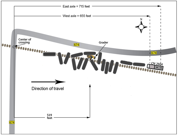 Unable to stop in time, the train collided with the stationary road grader. The force of the collision propelled the road grader eastward for approximately 519 feet where it came to rest on the north side of the track. The grader operator sustained fatal injuries. The lead locomotive (CN 2604) continued east and derailed approximately 715 feet past the crossing. In addition, 16 loaded dangerous goods tank cars carrying petroleum crude oil (UN 1993) derailed (Figure 2). Four DOT Class 111 cars were breached and released 106 000 L of crude oil. The locomotive sustained damage to the long hood and running gear due to the collision and derailment. The crew was uninjured.