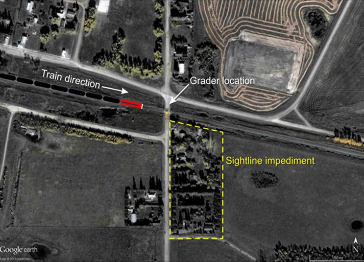- A driver’s view of an approaching train (to the west) from within the cab of a grader of the same make and model was evaluated. There were no visual impediments attributable to the design of the grader that would have obstructed the view of the approaching train.