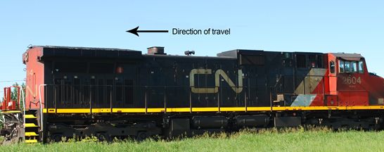 The occurrence locomotive had the horn positioned in the middle of the locomotive in an area on the roof which is recessed. At this location, the horn is below the bulkhead of the locomotive cab. When operating the locomotive in long hood leading orientation, the flutes of the locomotive face opposite the direction of travel (Photo 2).