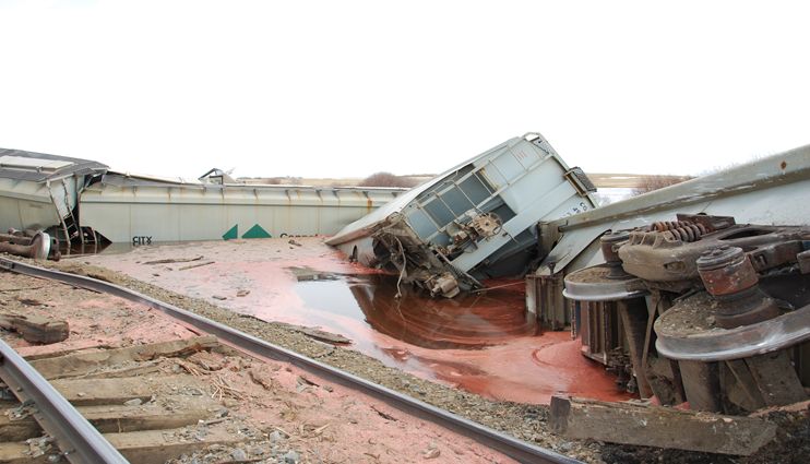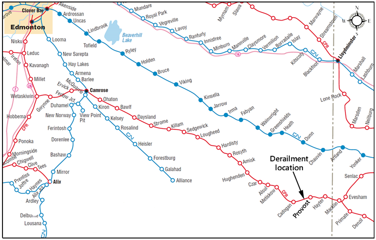 At 0355, while travelling westward on the Hardisty Subdivision at about 23 mph, a train-initiated emergency brake application occurred. After making the necessary emergency broadcast and notifying the rail traffic controller (RTC), the conductor performed an inspection and determined that the 17th car behind the lead locomotives had been the first car to derail. A total of 17 cars had derailed beginning at Mile 80.70, near Provost, Alberta (Figure 1). The 17 derailed cars lost varying amounts of potash, either in the derailment or during the subsequent derailment recovery operation. There were no injuries.