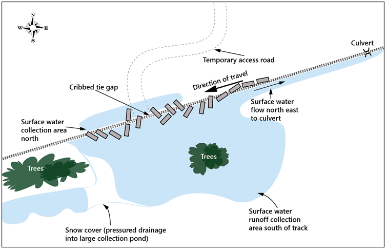 In the 4 days prior to the occurrence, daytime temperatures had been abnormally warm followed by cooler nights, which had resulted in a steadily increasing seasonal run-off water volume from the melting snow. The natural drainage at this location was from the west. Excess water would normally pass through a culvert east of the POD to the north side of the track. However, ice in the south ditch restricted the flow of the high volume of run-off water from the rapidly melting snow, allowing the water to back up in the ditch. It is also possible that the culvert itself was partially iced up. Due to the limited capacity of the drainage system and the southern exposure, the water level remained higher on the south side of the track relative to the north side, resulting in above normal water level infiltration and saturation of the track subgrade.